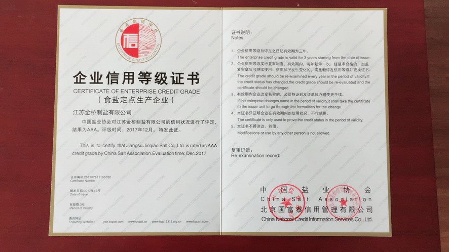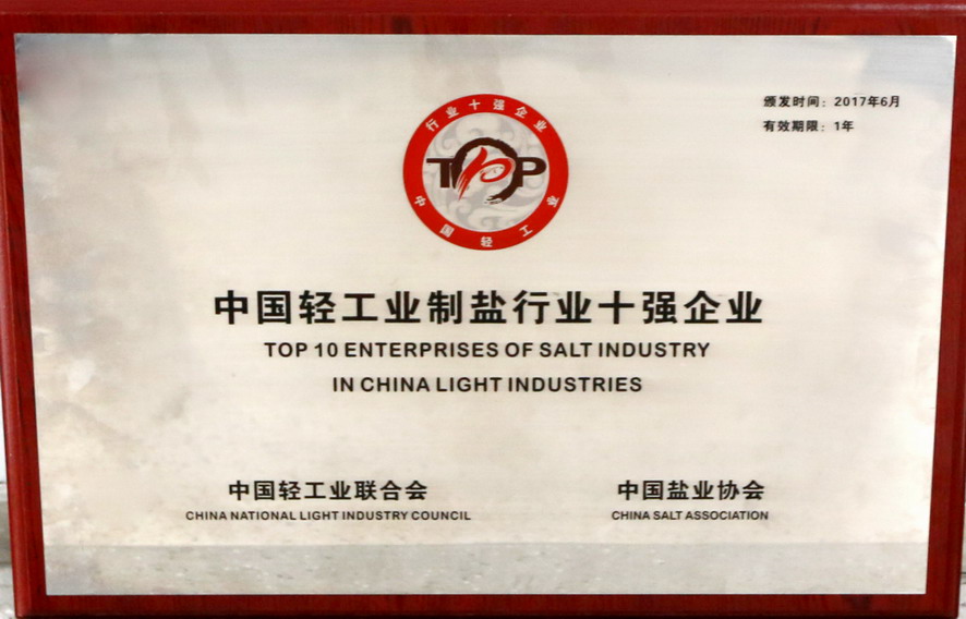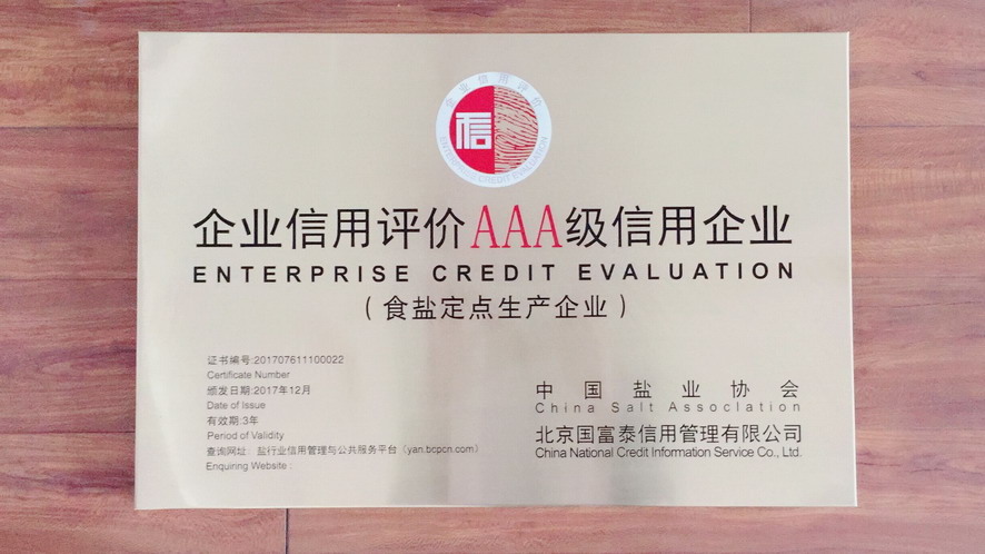 按照主營業務收入、利潤、主營業務收入利稅率及主營業務增速四項指標評價,2016年集團公司被中國輕工業聯合會和中國鹽業協會評為中國輕工業制鹽行業十強企業。根據《社會信用體系建設規劃綱要(2014—2020)》,經第三方專業評價機構和中國鹽業企業信用等級評價委員會審核并向社會公示,2016年江蘇金橋制鹽有限公司被評為AAA級食鹽生產企業。