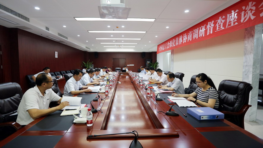 7月11日下午,由河北省總工會黨組成員、副主席萬小明為組長的全國總工會第八調研督查組一行走進工投,對我公司落實中華全國總工會深化集體協商工作規劃情況開展調研督查,江蘇省總工會權益保障部部長臧鐵柱,市人大常委會副主任、市總工會主席鄭平,市總工會黨組書記、副主席丁維杰,副主席秦云,集團公司董事長、黨委書記楊龍,黨委委員、工會主席戴鴻鳴陪同調研。