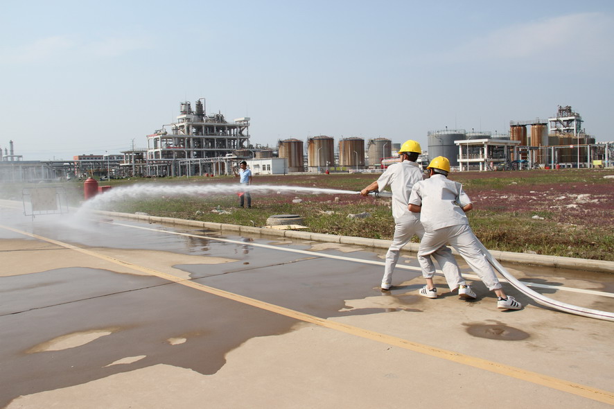 比武前,由消防教官對操作技巧、要領、安全注意事項進行了說明,各參賽隊3人一組依次進行比賽,發(fā)令后,接水袋、連水槍、開消火栓、沖向目標、擊中火源點,動作連貫無差錯的情況下比速度,最后黃化制鈣代表隊以15.07秒的優(yōu)異成績獲得一等獎,金橋制鹽代表隊、神特新材料代表隊獲得二等獎,供電公司代表隊、氨綸公司代表隊和臺北投資公司代表隊獲得三等獎。