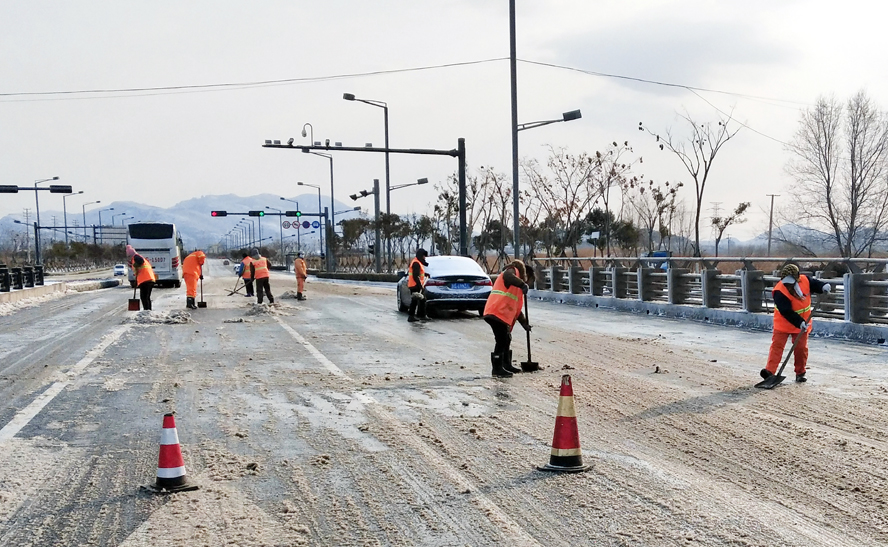 裕升、裕欣、裕祥三家養(yǎng)護(hù)公司組織綠化、保潔人員配合除雪車、裝載機等機械設(shè)備對花果山大道、黃海大道、東方大道、242省道、新光路及大浦路等主干道進(jìn)行清雪作業(yè);對程圩橋、先鋒大橋等橋面易積雪路段以及馬山路立交、新光路涵洞等“上跨下穿”路段采用撒氯化鈣的方式,加速積雪融化,并安排人員及時掃除積雪,防止路面因低溫降雪產(chǎn)生冰凍,對交通安全造成影響;對創(chuàng)智綠園廣場、火車站廣場及匝道等窗口地段采用人機結(jié)合的形式清掃積雪。盛達(dá)市政公司、瑞泰服務(wù)公司及益豐園林公司在提供鏟車、平板車、裝載機等機械車輛配合掃雪的同時,積極做好后勤服務(wù),為清雪工作有序開展提供保障。截至到中午,各條主干道積雪已基本清理完畢,道路恢復(fù)暢通,保障居民出行和交通安全。