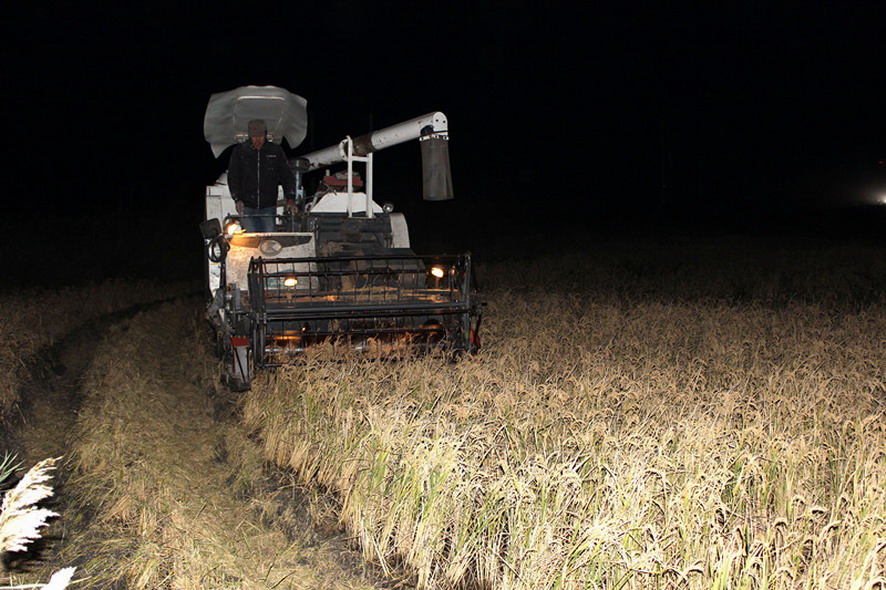 11月9日夜七時許,青口投資公司大新農場,工會副主席王士超作為巡查組成員,正在組織二分場趙華勇條田水稻種植戶在搶收水稻。