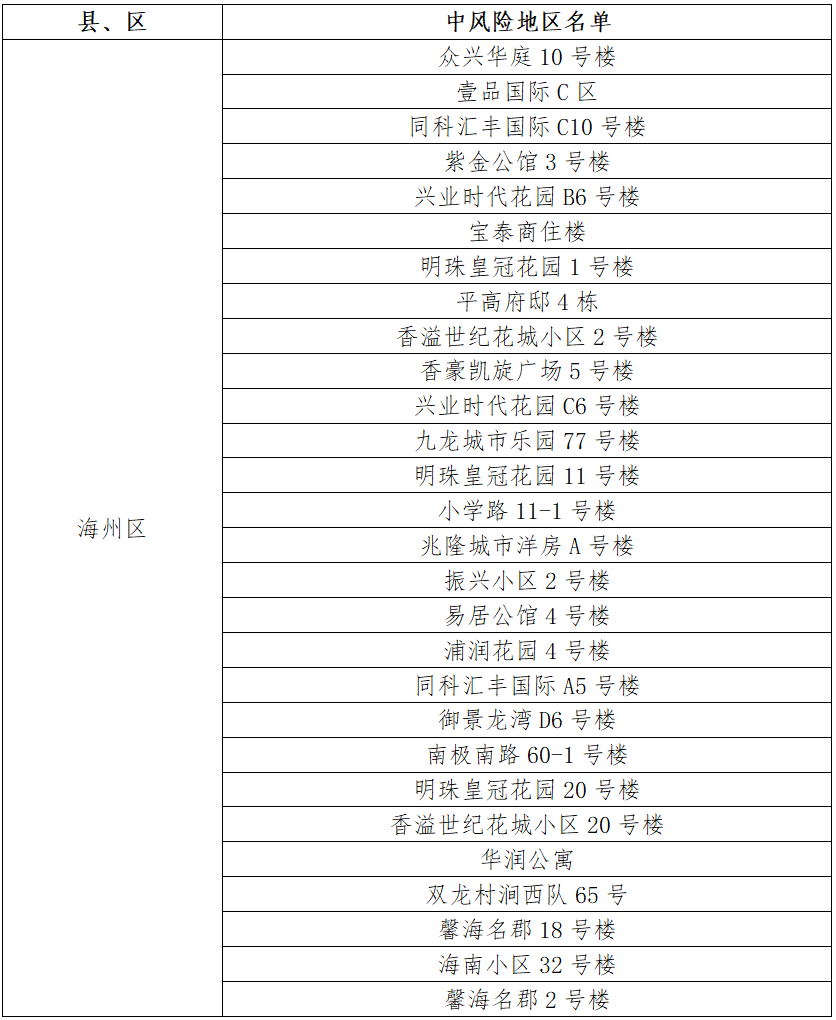 根據(jù)國務(wù)院聯(lián)防聯(lián)控機制有關(guān)規(guī)定,經(jīng)市指揮部研究決定,自發(fā)布之日起,對我市部分區(qū)域疫情風險等級進行調(diào)整:海州區(qū)天順國際花園7號樓、鳳凰名都10號樓、御景龍灣C1號樓、天順國際花園11號樓、御景龍灣A4號樓、香溢江南小區(qū)12號樓、同科匯豐國際A2號樓、平高書香名邸1號樓、香溢江南小區(qū)7號樓、西門村楊鳳莊21號、鳳凰名都9號樓、園林村白虎山小區(qū)78號樓、江化北路82-5號、金色大漠、平高書香名邸4號樓、朐陽街道花園路1號、制藥巷5-114、萬潤泰和苑4號樓由中風險地區(qū)調(diào)整為低風險地區(qū)。其他地區(qū)風險等級不變。調(diào)整后全市現(xiàn)有28個中風險地區(qū)。