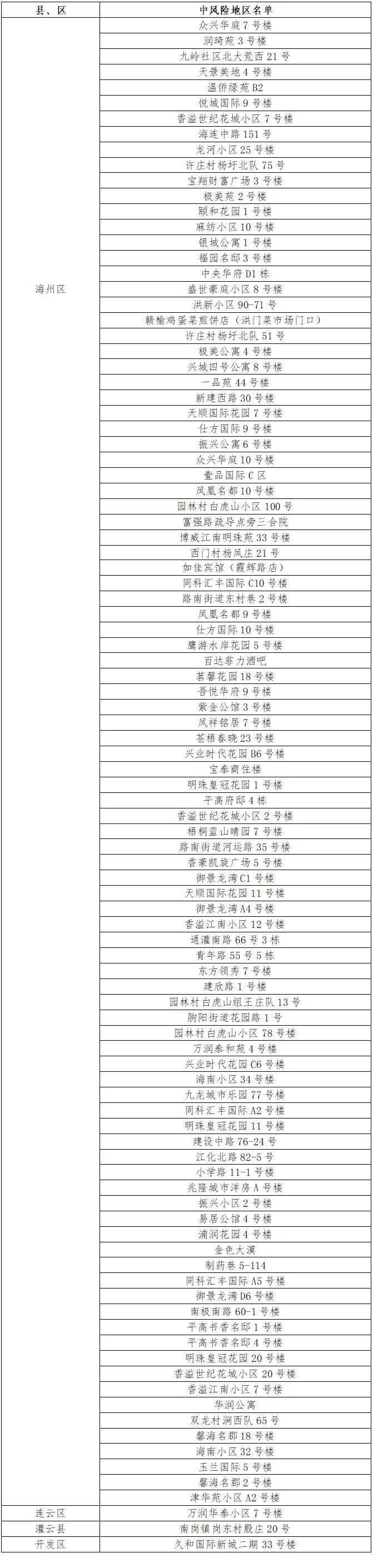 根據(jù)國(guó)務(wù)院聯(lián)防聯(lián)控機(jī)制有關(guān)規(guī)定,經(jīng)綜合評(píng)估研判,市指揮部決定,自發(fā)布之日起,將海州區(qū)明珠皇冠花園20號(hào)樓、香溢世紀(jì)花城小區(qū)20號(hào)樓、香溢江南小區(qū)7號(hào)樓、華潤(rùn)公寓、雙龍村澗西隊(duì)65號(hào)、馨海名郡18號(hào)樓、海南小區(qū)32號(hào)樓、玉蘭國(guó)際5號(hào)樓、馨海名郡2號(hào)樓、津華苑小區(qū)A2號(hào)樓調(diào)整為中風(fēng)險(xiǎn)地區(qū)。