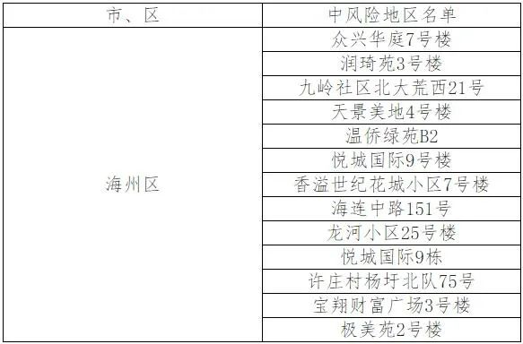 根據(jù)國(guó)務(wù)院聯(lián)防聯(lián)控機(jī)制有關(guān)規(guī)定,經(jīng)綜合評(píng)估研判,市指揮部決定,自發(fā)布之日起,將龍河小區(qū)25號(hào)樓、悅城國(guó)際9棟、許莊村楊圩北隊(duì)75號(hào)、寶翔財(cái)富廣場(chǎng)3號(hào)樓、極美苑2號(hào)樓調(diào)整為中風(fēng)險(xiǎn)地區(qū)。