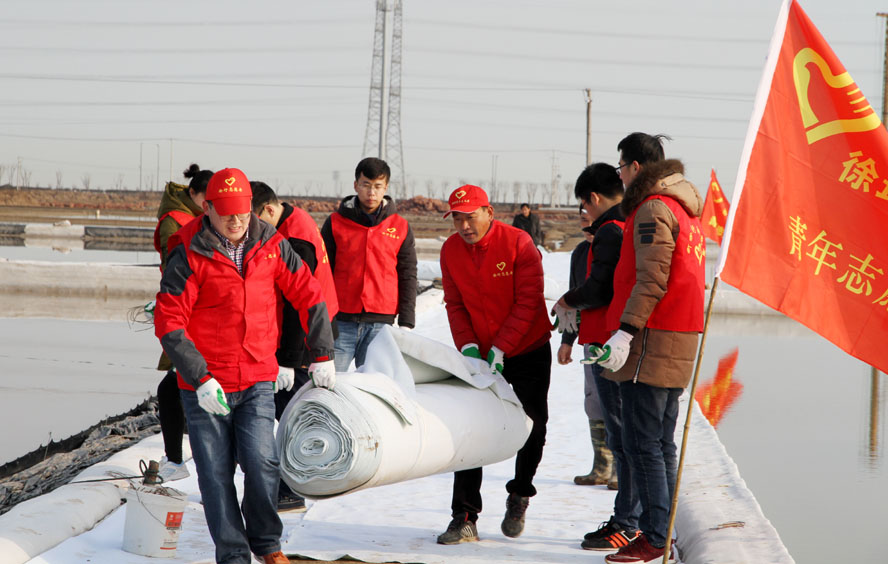111上午,徐圩投資公司團委組織部分青年志愿者到新灘原料鹽基地十組一單元協助完成土工布貼埝工作。