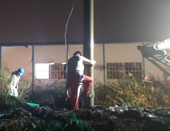 今年的10月天氣還是熱的厲害,電桿被太陽曬的滾燙,搶修人員臉上掛滿了豆大的汗珠,工作服已經全部濕透。為了搶時間,抓進度,作業人員們全然不顧,依然緊張有序地工作著。現場搶修工作涉及吊車、挖掘機等大型施工機具,安全管控尤為重要,現場所有搶修人員在工作負責人的指揮下平穩有序的推進搶修工作,吊車擺放位置、挖掘機挖桿洞的位置等每一個關鍵工作點都在搶修人員的嚴格監督下進行,不敢有絲毫松懈。就在這時,天公不作美,突然下起了大雨,可是大雨并沒有攔住搶修工作。臺北供電所現場所有的搶修人員在錢所長的帶領下,穿著濕透的工作服在雨中指揮挖掘機開挖桿洞、組立電桿、連接導線-------搶修人員在天昏地暗的雨中穿梭,雨水和汗水交匯在電力搶修人員的臉龐上,大家都來不急擦拭一下臉上的雨水,在雨中忙碌著。經過4個半小時的緊張有序搶修,晚上19:30分10KV港北線恢復供電。