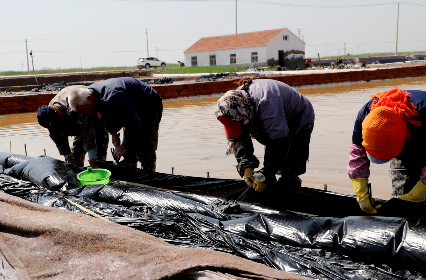 在新河的八班,員工有的在補塑料布,有的在疏通排水溝道,整理繩索,也是忙的熱火朝天。為了抓好二季度工作,八班以生產合格原料食用海鹽為目標,緊抓有利天時,進一步創新海礦鹵勾兌制鹽工藝,細化工作措施,責任到人,著力提升原鹽質量和產量,目前已生產海水鹽4000噸。