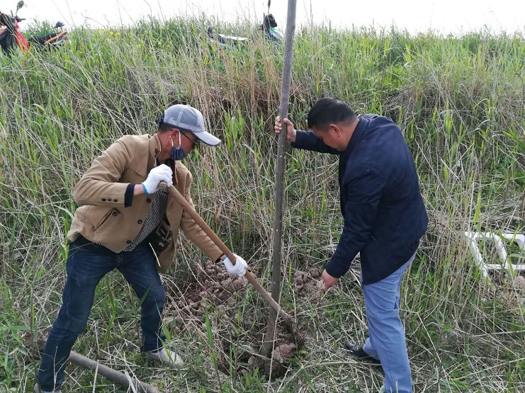 大家下午一點三十出發(fā),每人帶上鐵锨或者鐵楸,前往目的地。全體員工都相互協(xié)作,四人一組搬運樹苗,填土栽植,經(jīng)過兩天的勞動完成了二百三十三畝土地共五百四十棵樹苗的栽植任務。