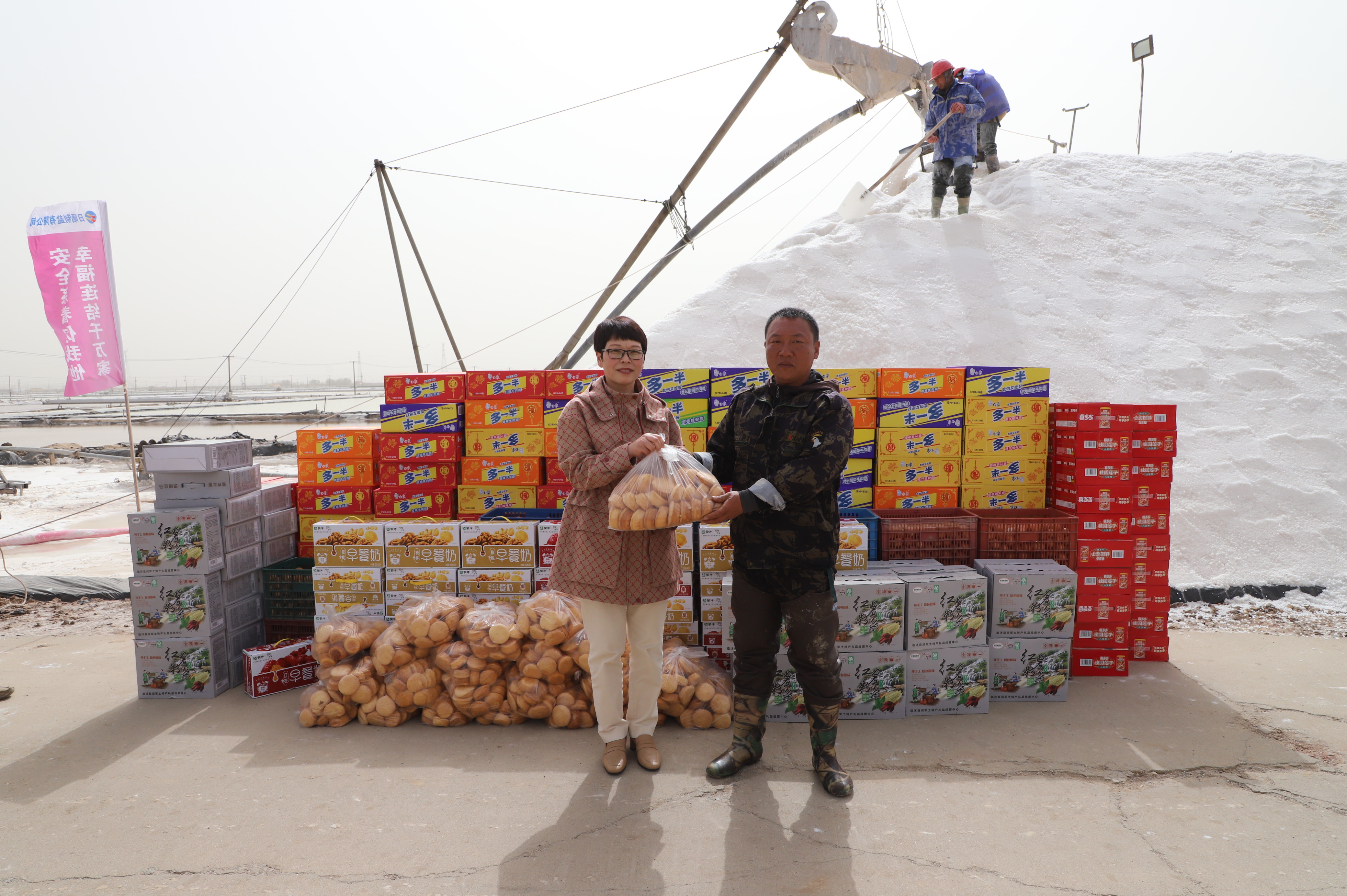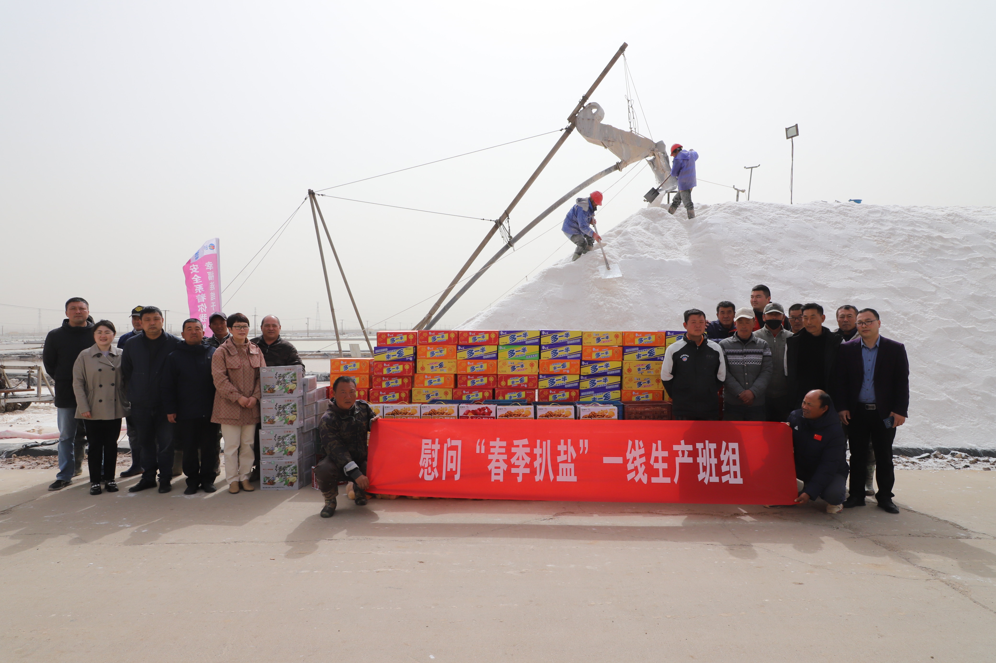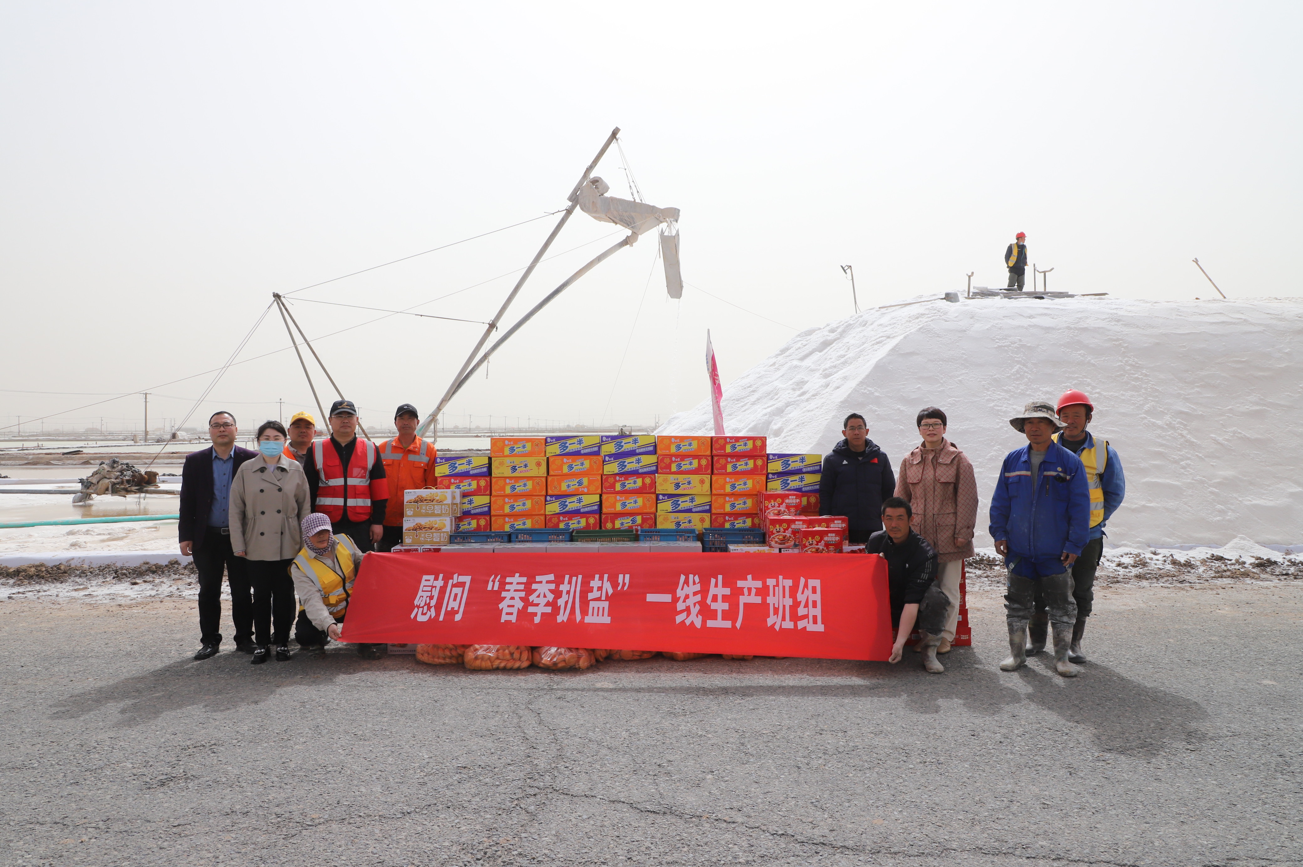 “你們辛苦了,我代表公司來看望大家?!痹谛潞泳虐嗯c埒南九班,王宏與扒鹽現場職工握手問好,感謝他們在過去的一年為日曬制鹽公司的原鹽生產所付出的辛勤努力,叮囑他們一定要落實落細扒鹽生產措施,增強責任感和警覺性,嚴格執行各項規章制度,切實保障扒鹽期間的安全生產,并送上雞蛋、八寶粥、方便面、牛奶等物品。