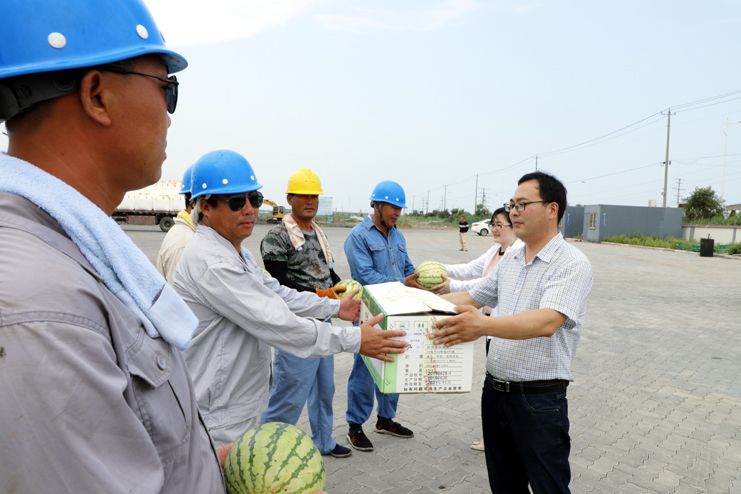 入伏以來,氣溫持續攀升,五灌河碼頭裝卸工作也迎來了夏季高溫的“烤驗”。為做好高溫酷暑期間的防暑降溫工作,確保職工工作安全和身心健康,7月25日,灌西工會一行到宵洋五灌河碼頭為堅守在崗位上奮戰的碼頭工人送去關懷和問候。
