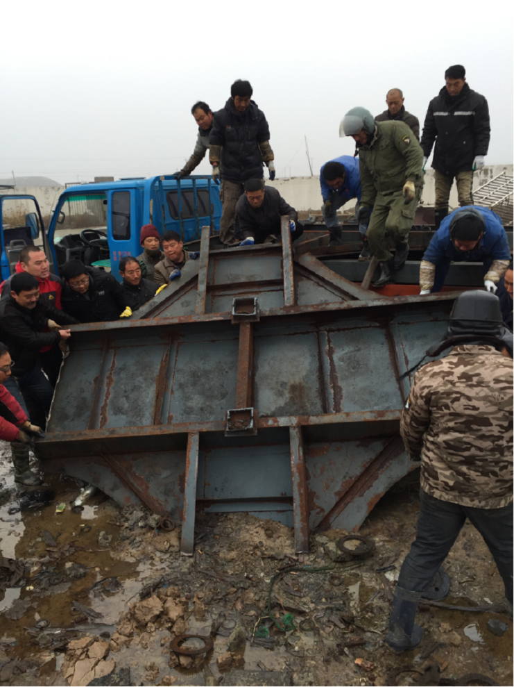 (上圖為標準化廠房的廢棄鋼材運送到日曬制鹽3場后家院,機械設備服務中心職工一起搬運鋼材。)