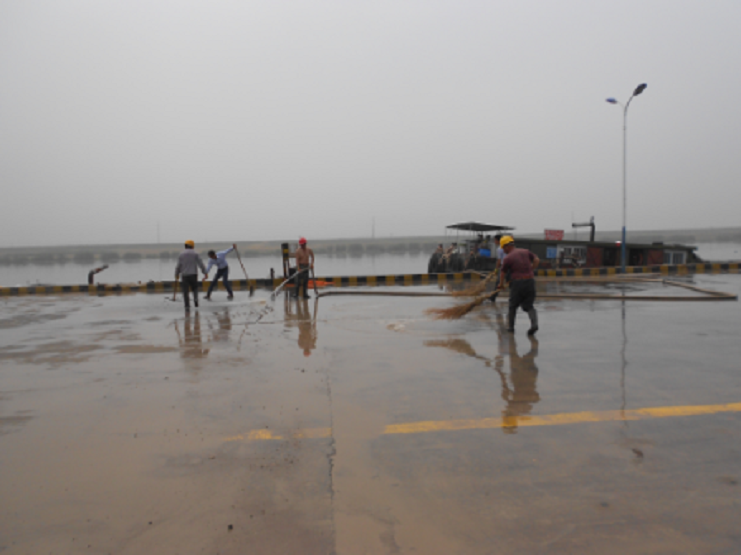 近期由于五灌河水位下降,給停靠碼頭的船只帶來了很大的安全隱患,于是公司決定對(duì)碼頭岸線的河道進(jìn)行一次清淤工作,在清淤的運(yùn)輸過程中使碼頭作業(yè)區(qū)一片狼跡,為了不影響宏港石化的PPA噸袋的吊裝業(yè)務(wù),6月11日上午公司班子成員主動(dòng)放棄休息日與上班工人一道對(duì)碼頭作業(yè)區(qū)進(jìn)行清理,他們有的用水槍沖,有的用掃帚掃,經(jīng)過二個(gè)多小時(shí)的奮戰(zhàn),作業(yè)區(qū)場(chǎng)地上渙然一新。(宵洋葛高平)