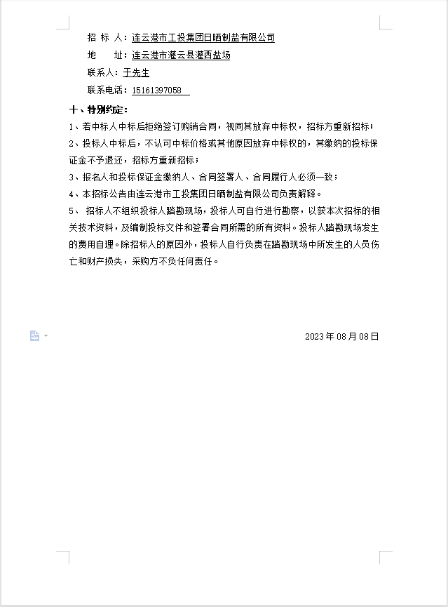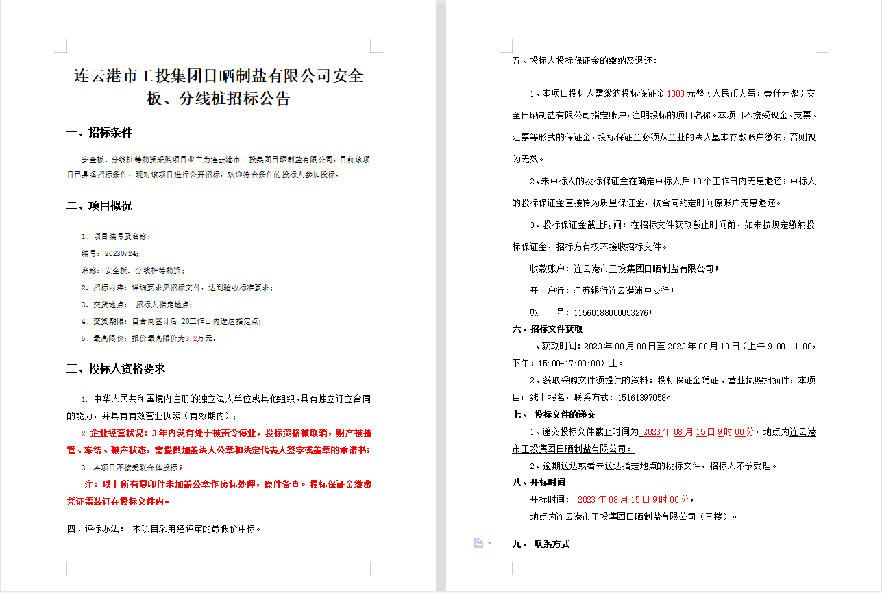 連云港市工投集團日曬制鹽有限公司安全板、分線樁招標公告