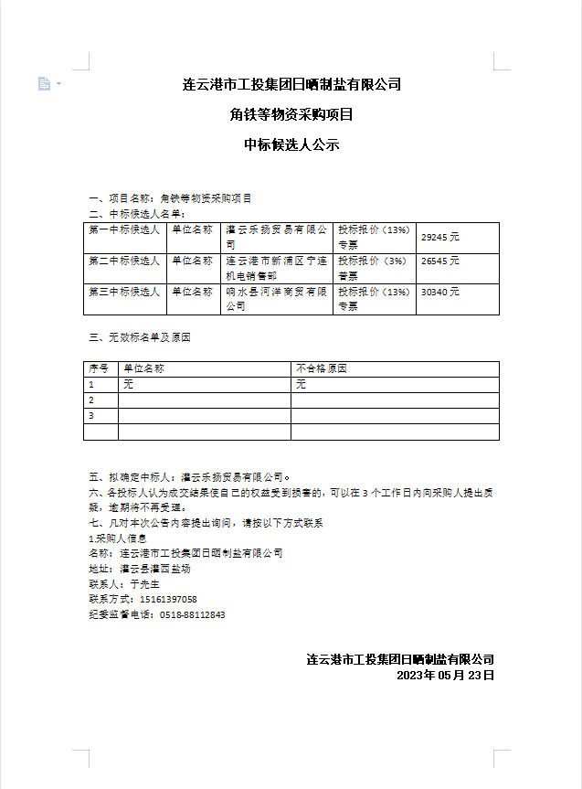 連云港市工投集團(tuán)日曬制鹽有限公司角鐵等物資采購項(xiàng)目中標(biāo)候選人公示