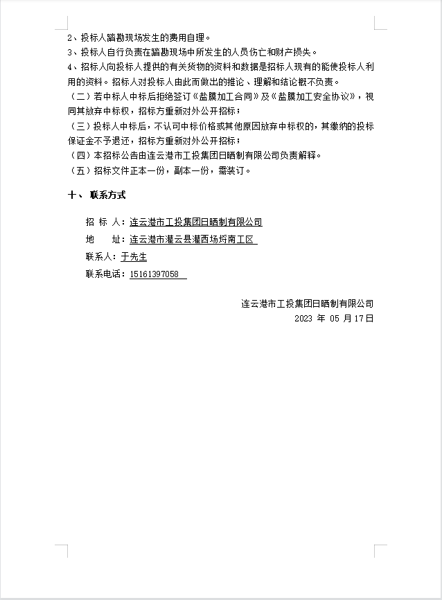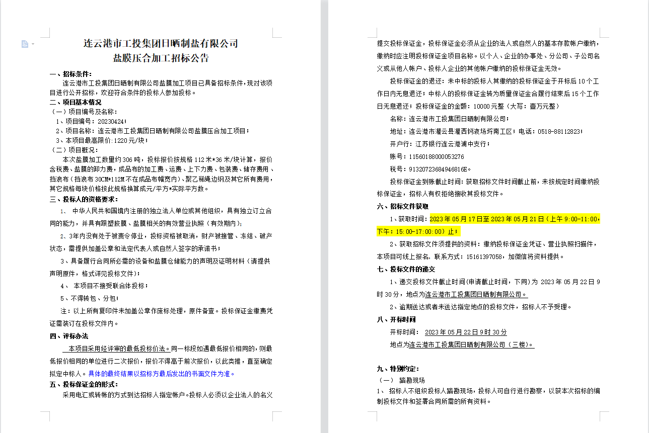 連云港市工投集團日曬制鹽有限公司鹽膜壓合加工招標(biāo)公告