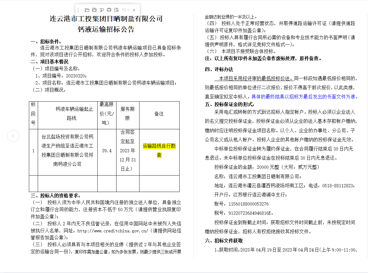 連云港市工投集團日曬制鹽有限公司鈣液運輸招標(biāo)公告