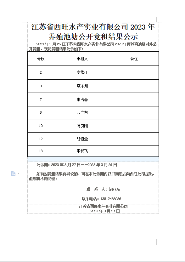 江蘇省西旺水產(chǎn)實(shí)業(yè)有限公司2023年養(yǎng)殖池塘公開競(jìng)租結(jié)果公示