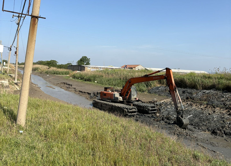 三洋分場高效養殖基地,挖掘機正揮舞手臂,進行進排水渠疏浚作業,為防汛做好前期準備工作,保障汛期安全穩定。(青宣 田盛楠 史小佟)