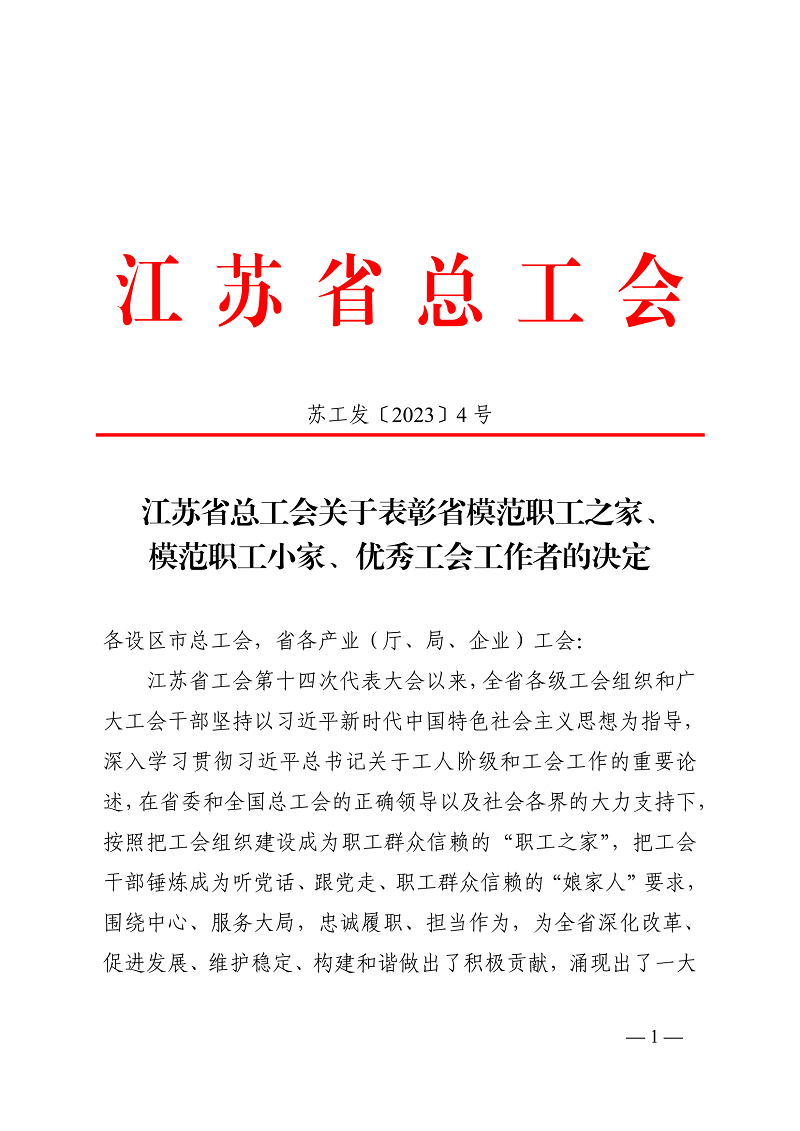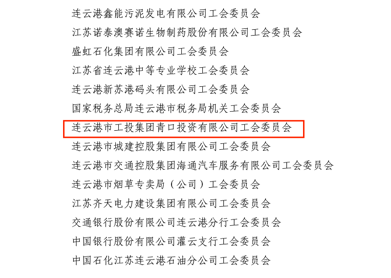 根據(jù)《江蘇省總工會(huì)關(guān)于表彰省模范職工之家、模范職工小家、優(yōu)秀工會(huì)工作者的決定》(蘇工發(fā)【2023】4號(hào))文件精神,青口投資公司工會(huì)榮獲“江蘇省模范職工之家”稱號(hào)。