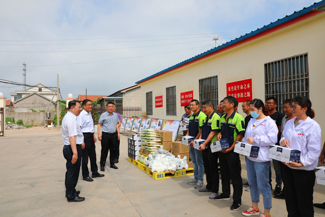 7月28日上午,集團公司黨委副書記戴鴻鳴、工會主席劉承志一行,到青口公司慰問堅守在高溫一線的職工, 為職工們送去了綠豆、牛奶等防暑降溫物品,公司部分班子成員陪同慰問。