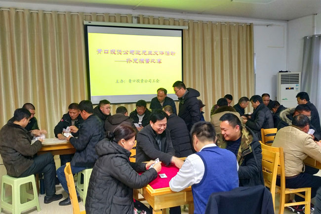 27日,在職工活動室,約50名員工參加了撲克牌摜蛋比賽。賽前選手通過抽簽決定對手,采取淘汰賽方法進行。比賽中參賽選手聚精會神、密切配合、精確計算、謹慎出牌。對陣雙方比牌技、比智慧、賽成績、賽友誼。每一局比賽結束,不時傳出參賽選手懊悔和興奮的唏噓聲,也有旁觀者贊嘆和惋惜的評價,比賽就在這樣時而緊張、時而熱烈的氣氛中進行。經過激烈、公平、公正的角逐,黃沙分場代表隊的劉英軍、李召田獲得冠軍,米業營銷的的嚴鑫、葛蘇獲得亞軍。
