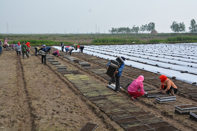 種糧大戶俞正猛正在張羅工人們擺盤育秧。運盤、擺盤、覆膜、壘土,工人們或快速或仔細地高效運轉著,三輛三輪車前后停在田埂上,車上整齊的擺放著數以萬盤的暗化苗,這些暗化苗來自生態種養中心育秧大棚,硬盤里面一層軟盤放入基質,撒入稻種,在大棚里通過一定的溫度和濕度的科學管理,出芽后運送到各個田頭。男工負責把硬盤在秧板上均勻放好,再由心細的女工把軟盤從硬盤上拿出擺放在秧板地上,一條秧板擺完,立刻蓋上無紡布薄膜,就地挖土壓住防風,保護好秧苗不被曬傷。空的硬盤運到田邊由專人整理回收最后運回生態種養中心。全部擺完以后上好水,一整套工序就算完成。不到一天時間,一萬多盤秧盤已經被工人們全被擺完。