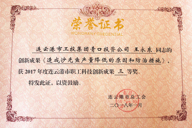王永東經(jīng)多年摸索研究與實(shí)驗(yàn)總結(jié)出的《造成沙光魚(yú)產(chǎn)量降低的原因和防治措施》,曾在《北方水產(chǎn)》上刊登。公司工會(huì)收集資料,申報(bào)市職工科技創(chuàng)新項(xiàng)目。因該項(xiàng)技術(shù)成熟可靠,對(duì)沙光魚(yú)各種疾病愈后效果良好而得到認(rèn)可,最終獲得2017年度連云港市職工科技創(chuàng)新成果三等獎(jiǎng)。