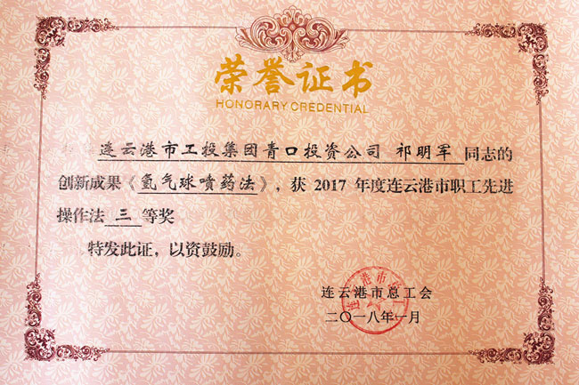 祁明軍的《氫氣球噴藥法》獲得2017年度連云港市職工先進(jìn)操作法三等獎(jiǎng)。由他發(fā)明的氫氣球噴藥法,噴藥機(jī)結(jié)構(gòu)簡(jiǎn)單,成本低廉,且可靈活調(diào)整,省工省時(shí),霧化效果好。目前該操作法已在青口公司全面推廣使用。 (青工)