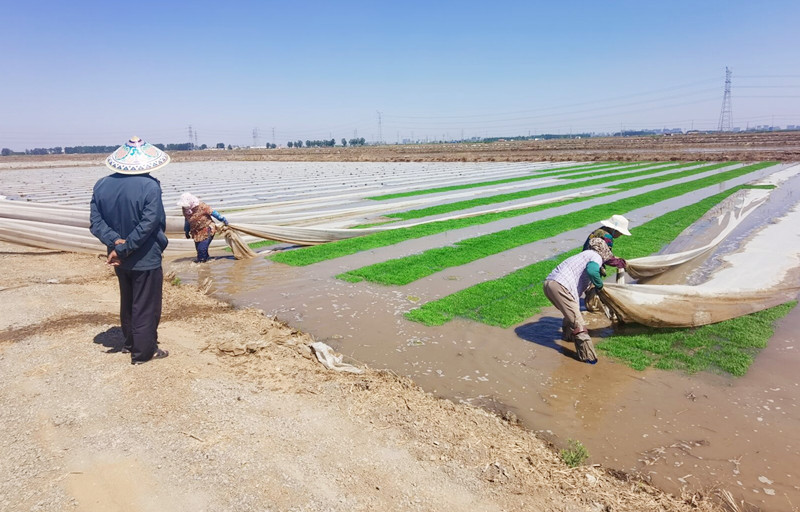 近日,大新農場自營農田機插秧苗已全部揭開無紡布,秧苗整體長勢較好,一片綠意盎然。目前播種較早的秧苗苗齡在三葉一心。(劉 楊)