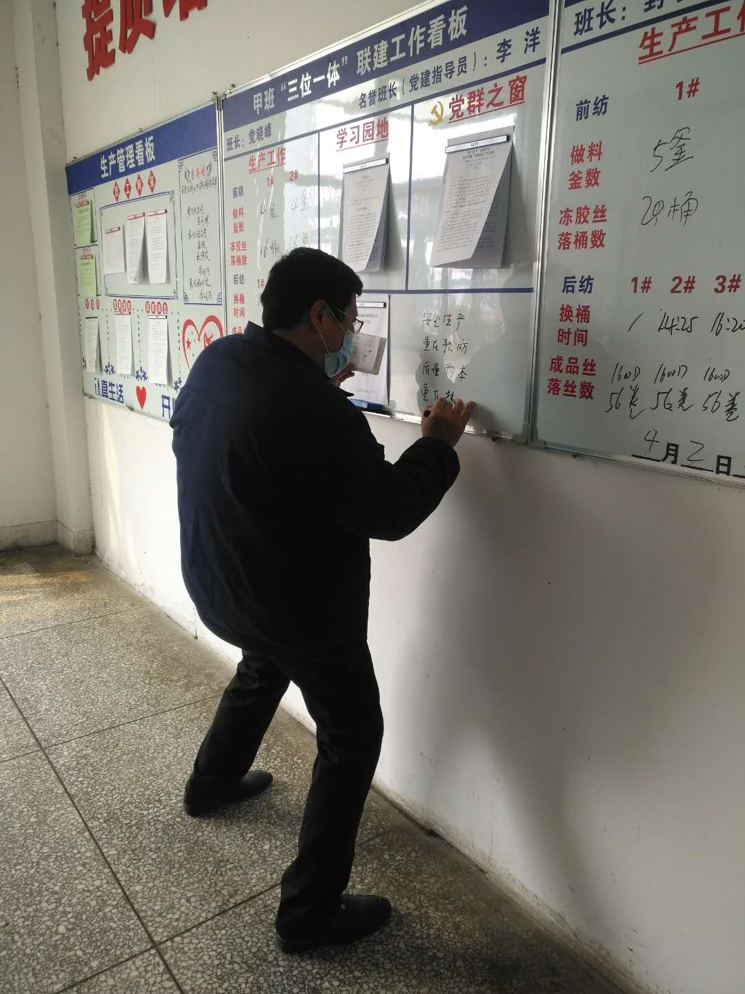 圖為生產(chǎn)設(shè)備部副部長王勇為甲班書寫班組口號。