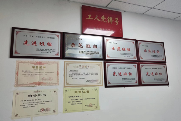 走進質檢辦公室,首先映入眼簾的就是這面榮譽墻,上面有近年來集團頒發的“示范班組”和公司授予的各種榮譽,還有一塊金字招牌,就是市總工會頒發的“工人先鋒號”。