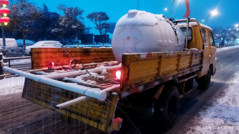 ? ? ? ? 今天(2月4日),港城普降暴雪,臺北華茂全員出動500余人次,大小機械100余臺(班),全力確保了轄區交通線暢通。這中間,出現一臺除雪“核武器”,這就是翔立分公司自制的鈣液噴淋除雪車。