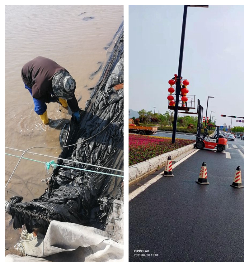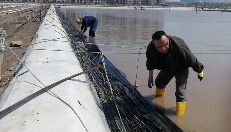 復曬灘上,昨天冰雹造將擋浪布擊的千瘡百孔,為了保住勞動成果,天還未亮時,翔立人就走上灘頭進行搶修更換,以確保利用好天時退布復曬生產高濃度鈣液,實現鈣業的產銷再創新高。