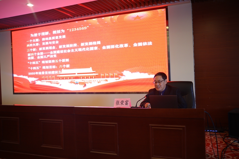 下半場,張校長從一個主題,推動高質量發展;兩件大事,發展與安全;三個新,新發展理念、新發展階段、新發展格局;新四個全面,全面建設社會主義現代化國家、全面深化改革、全面依法治國、全面從嚴治黨;“十四五”規劃堅持五個原則;“十四五”規劃目標,六個新;2035年遠景目標建議九項措施等九個方面解讀了全會精神的“新征程 新理念 新格局 新愿景”。