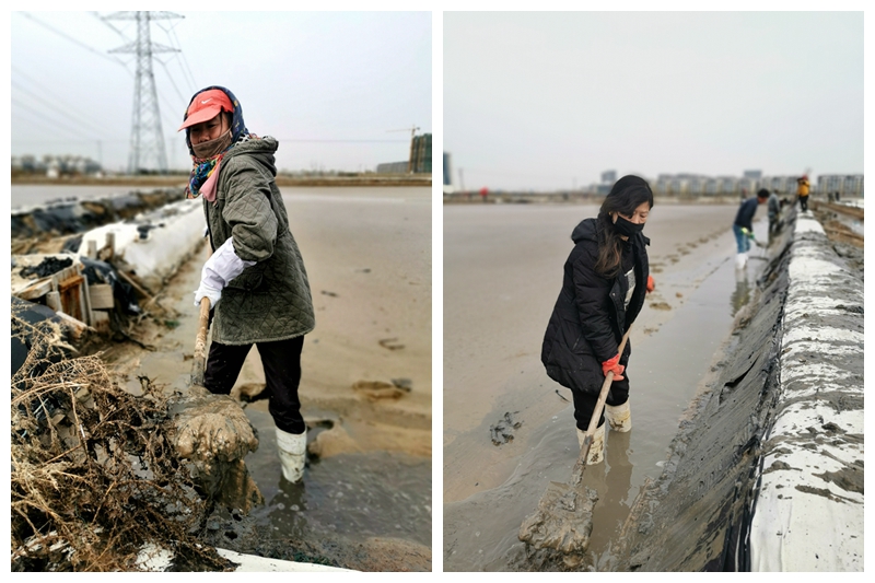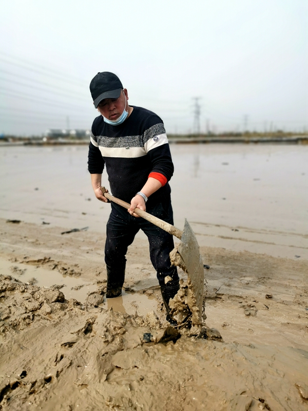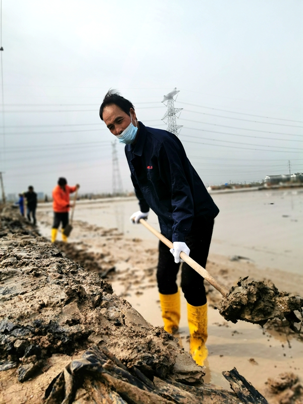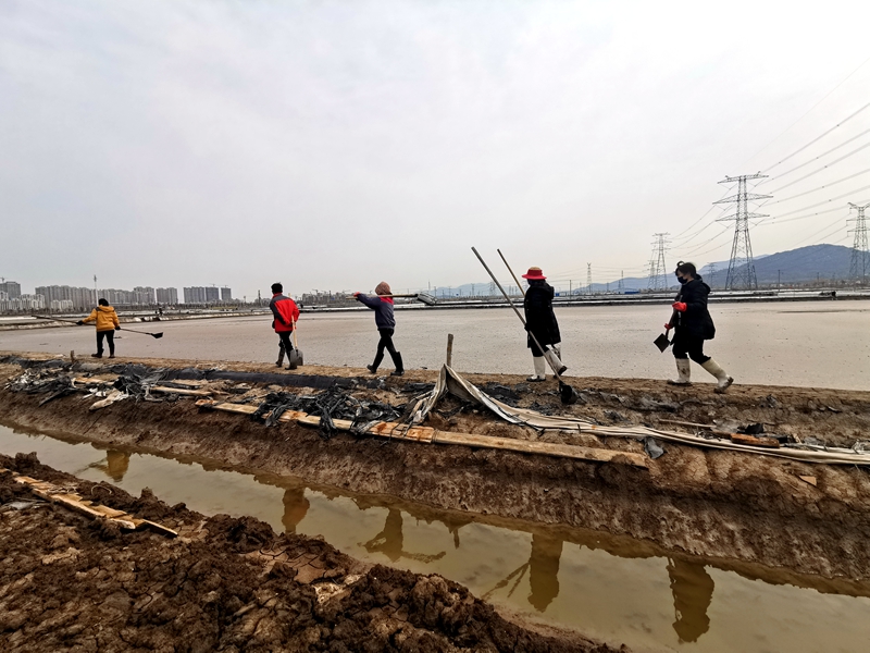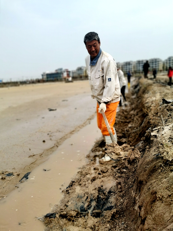 往東邊看,先鋒東灘黨旗招展分外鮮紅,海州灣公司18個單元職工、3名班組長全員出動馳援大浦工區協同重整410畝閑置鈣鹽灘地。引水入溝、翻泥上堰、腳踩和整、鐵掀蹋平,動作嫻熟。1200余米的10余條池堰僅用一天的就順利完工。