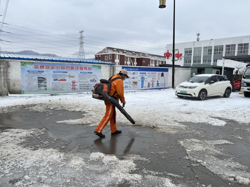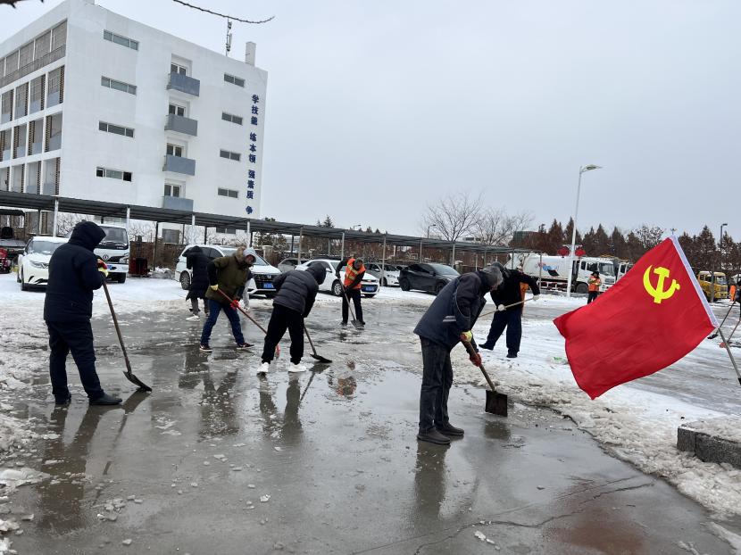 在清理工作現場,該公司負責人趙陽帶領黨員干部攜帶各種除雪工具,先后來到各自的責任區開始清除積雪,有的奮力潑灑融雪劑;有的拿著大板鍬,推著積雪露出一道道干凈的路面;有的在寒風中不停地揮舞著手中的鐵锨,使勁清理著被汽車壓結實的冰渣;有的將積雪一點點地集中到一起,然后用掃帚掃凈路面,大家你鏟我掃,團結協作,干勁十足,一片熱火朝天的除雪景象。