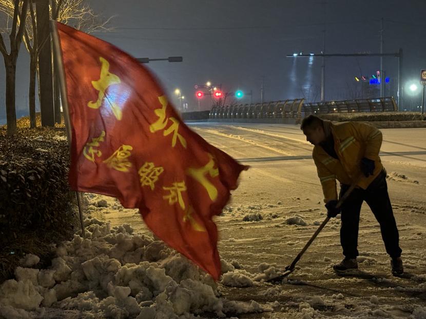 “搖人,快搖人”。環衛分公司迅速響應并于凌晨1點01分緊急啟動掃雪除冰應急預案,全力以赴迎戰風雪。