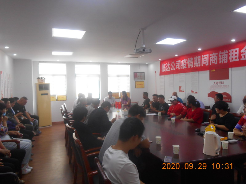 臨達(dá)公司黨支部堅(jiān)決和黨中央保持一致,堅(jiān)決擁護(hù)黨中央的決定,認(rèn)真學(xué)習(xí)了省、市以及集團(tuán)公司等減免疫情期間房租的相關(guān)文件精神,仔細(xì)研究、反復(fù)討論,經(jīng)上報(bào)臺北投資公司、集團(tuán)公司兩級黨委批準(zhǔn),9月29日下午,減免光伸建材市場、德蘭建材市場、金三角市場、原公司院內(nèi)倉庫、院外大棚、猴嘴山洞共48家商戶3個月租金,計(jì)52萬余元,減免金額達(dá)全年租金收入四分之一。