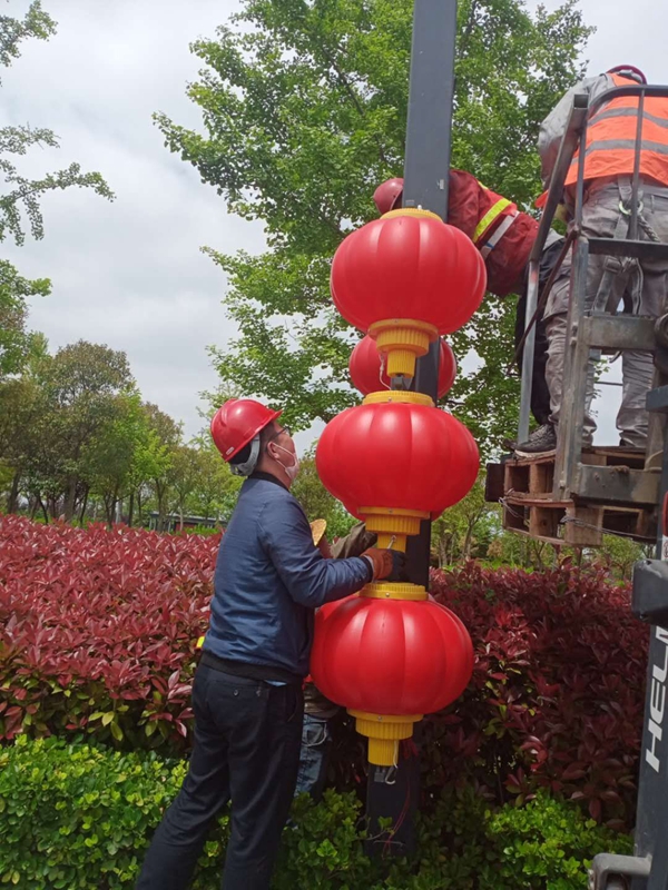 施工現場,大家配合默契利用小型叉車進行輔助拆除作業,五分鐘不用一個燈籠就拆除完成。這邊完成拆除部分,那邊負責還原以及運送回收。由于燈籠的不可收攏性,同時為避免造成二次污染,對于拆下來的燈籠及時進行運送和回收保存,確保第二年要安裝的時候重復利用。