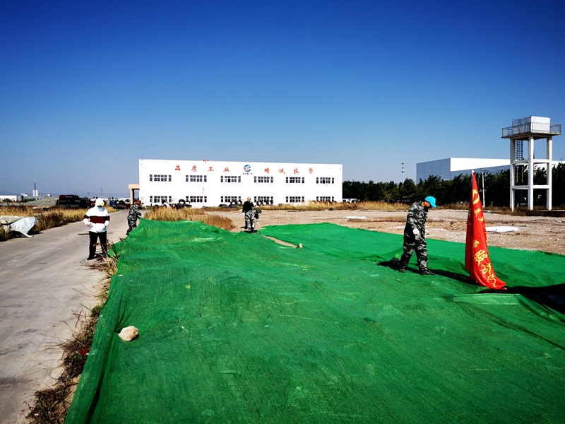 全體工作人員頂著烈日對(duì)黃土裸露區(qū)域進(jìn)行覆蓋。大家分工明確,有條不紊,一邊清理廢棄垃圾,一邊小心謹(jǐn)慎的扯著防塵網(wǎng)布與迎面吹來的大風(fēng)沙土博弈。大家不怕臟、不怕累,個(gè)個(gè)奮勇爭(zhēng)先。經(jīng)過半天的辛苦勞動(dòng),就完成了近萬平方的露天黃土覆蓋工作。放眼望去,一片“綠草茵茵”,看似不可能完成的任務(wù)在大家的同心協(xié)力下順利完工,自豪和喜悅油然而生。