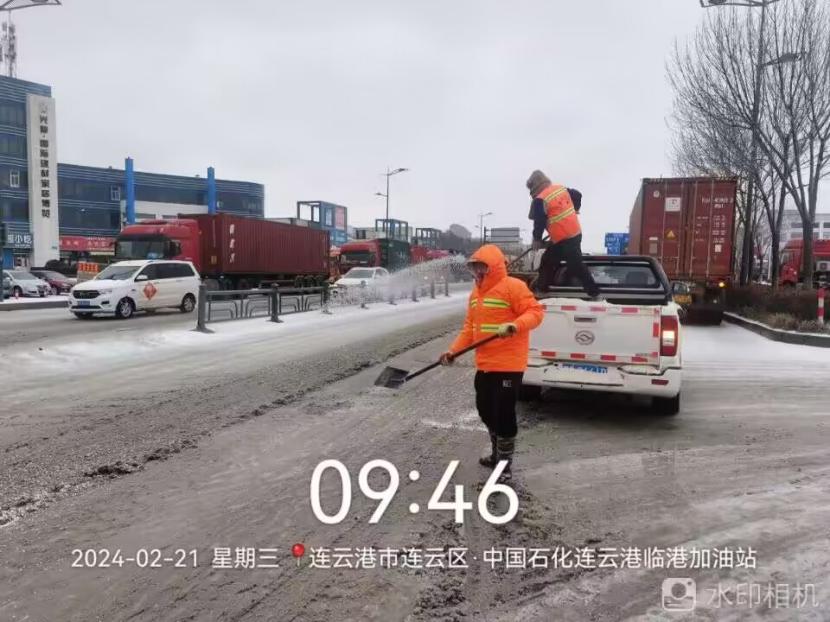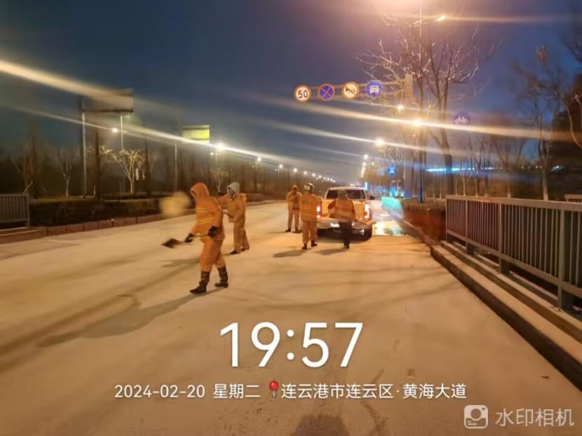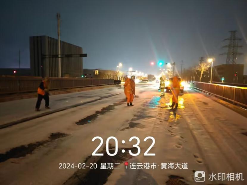 夜晚10點,在黃海大道,支部書記范曉寶親自帶隊,帶領張巖、盛小雷、薛加兵等6名黨員,冒雪奮戰、連續作業,拋撒融雪劑,進行緊急除雪除冰作業。
