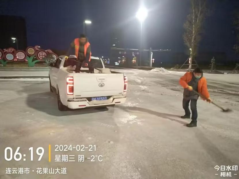 凌晨3點,葛中仁、孫銀、薛興華、伏廣軍奮戰在花果山大道除雪現場,由于冰凍嚴重、路面濕滑,工程車行進過程中舉步維艱,他們互相配合、齊心協力,時刻關注路面情況,確保道路無積雪、無結冰。