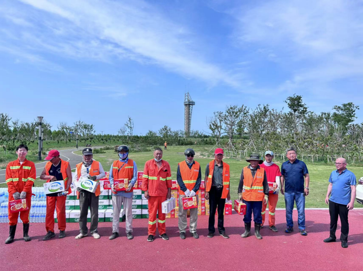 6月25日下午,正值端午假期,夏日驕陽,熱浪襲人,綠化工人扛著酷暑奮戰(zhàn)在樹木移植一線。同時,也牽動著公司領導的心。投資公司黨委書記、董事長、總經(jīng)理莊清付冒著炎炎烈日來到張圩湖公園,走訪慰問高溫下奮戰(zhàn)在一線的廣大職工。