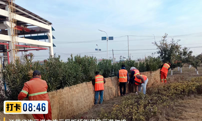 風障防寒加速進行。該分公司采購草簾500余個,對金港路、泰和路夾竹桃等不耐寒綠植精心呵護。確保低溫植株不被凍傷,不出現(xiàn)大面積凍害現(xiàn)象。目前已圍草簾300余個。