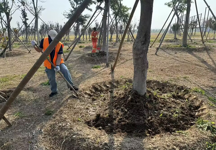 自十月中下旬以來,班組全體成員積極準(zhǔn)備,做好抗旱保障工作。每天早晨7點(diǎn),兵分二路,按照各自分工迅速行動(dòng)起來。葛承東帶領(lǐng)一部分工人對(duì)櫻花林、紅梅林整理樹圍;田恒亮帶領(lǐng)一部分工人施肥澆水,有的同志拎小提桶施肥,有的拿自來水管在后面澆水。為保證水流進(jìn)樹木根系,工作人員采取多種方法讓葉片、根系喝足水。為堅(jiān)決打贏這場(chǎng)抗旱保樹木攻堅(jiān)戰(zhàn),綠化分公司在堅(jiān)持科學(xué)用水、節(jié)約用水的前提下,通過科學(xué)的修剪植物、抹芽,松土,除草等措施確保苗木安全度過干旱天氣。由于抗旱工作啟動(dòng)較早,措施得當(dāng),抗旱保苗工作已取得初步成效。目前為止,已經(jīng)完成7000余棵櫻花林和紅梅林的施肥、澆水工作。
